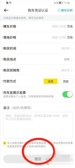 4、然后继续输入自己的购车信息,点击“提交”即可。