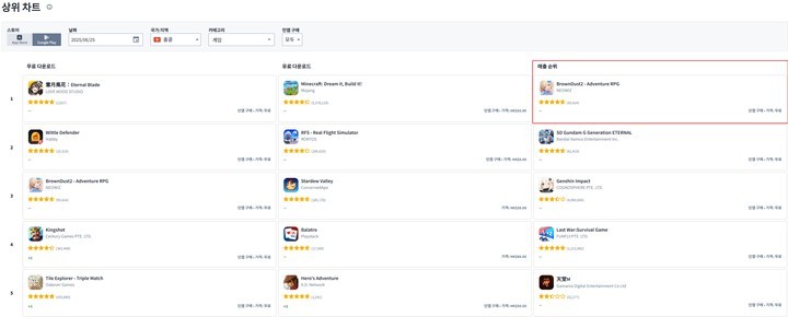 NEOWIZ 于 6 月 27 日宣布,由其发行、GAMFS N 开发的 RPG手机游戏《棕色尘埃 2》已在台湾、香港主要应用商店登上营收排行第一名。根据全球行动数据分析公司 Sensor Tower 的数据显示,《棕色尘埃 2》于 6 月 19 日在 Apple App Store 中分别登上台湾第 1 名与香港第 2 名,随后在 6 月 24 日于 Google Play Store 中获得台湾第 3 名与香港第 1 名,于两大平台皆进入营收排行榜前列。在韩国、日本则于 6 月 19 日在 Apple App Store 分别位居第 17 名与第 28 名,于 6 月 24 日在 Google Play Store 则为第 19 名与第 20 名。