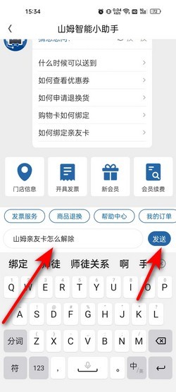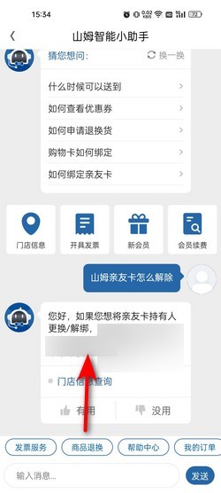 4、在对话框中键入难题,了解山姆亲友卡怎么解除。