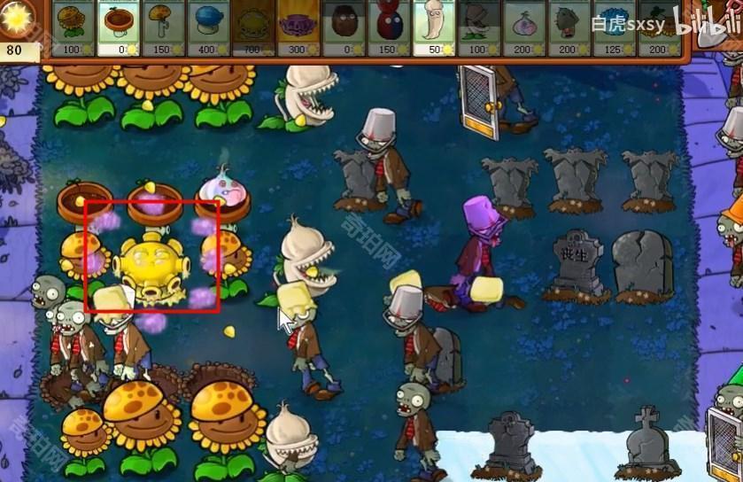 1、这一关是黑夜模式,我们先在前面种植一些免费的小盆菇来阻拦僵尸,后面种植向日葵收集能量。