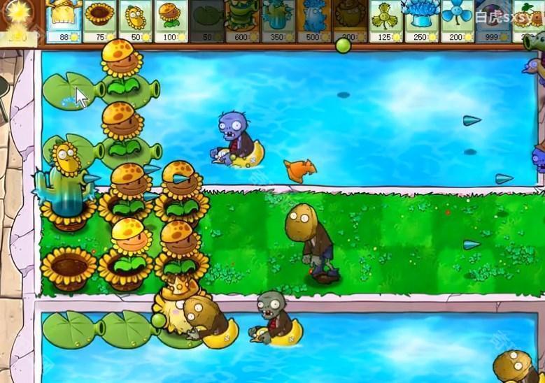 1、在草地上面种植阳光花盆,然后在水池里面放豌豆睡莲,种植一些向日葵收集阳光。