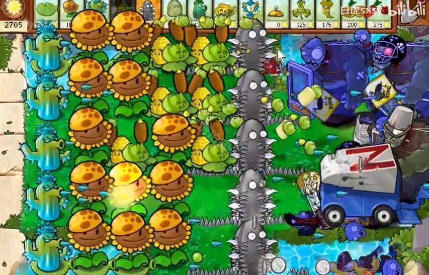 1、在旁边水池里面种植豌豆睡莲,这个不仅可以发射豌豆攻击,还可以当做踏板在水面上放其他植物。