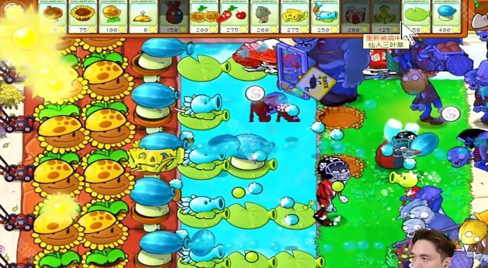 2、水池里面及时种上豌豆睡莲,然后在睡莲上面种上寒冰香蒲,豌豆睡莲也可以攻击。