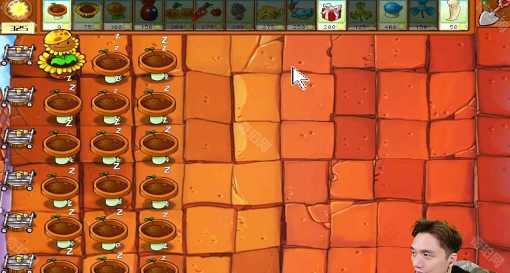 1、这一关给我们准备好了三排免费的小盆菇,我们在最后一排的小盆菇里面种植上阳光向日葵收集能量。