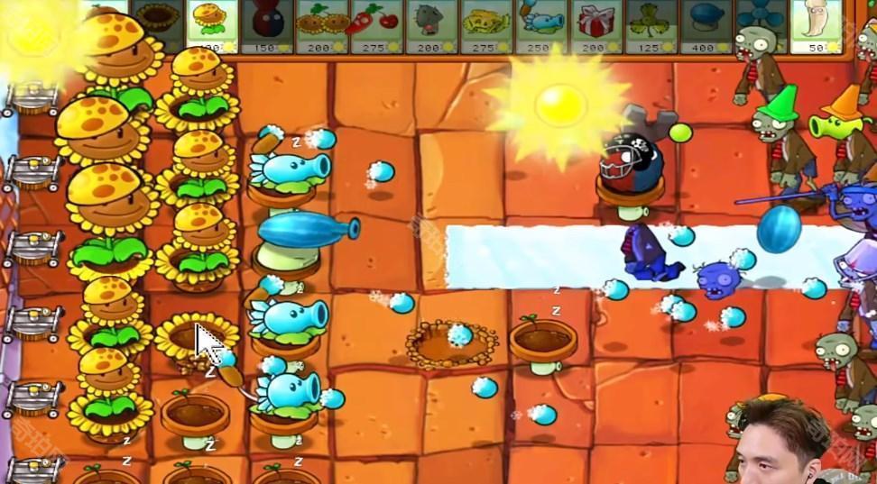 2、前方也可以放上一些免费的小盆菇来阻拦僵尸前进,其他路可以布置一些寒冰香蒲。