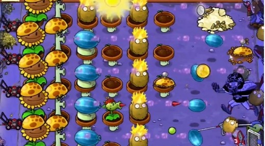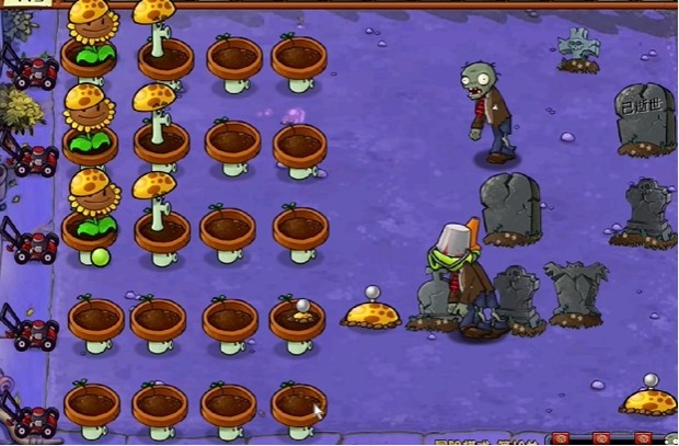 3、后排主要放阳光向日葵收集能量,前面放置土豆阻拦,土豆后面放置地雷埋伏僵尸。