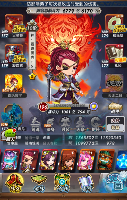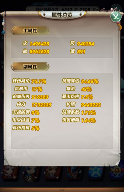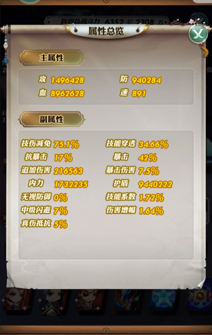 实例图组二:本组数据中霸道田虎位于后排,技能穿透值为24%(后排五人,受霸道田虎技能重霄影响,暴击伤害会比田虎位于前排时高20%)