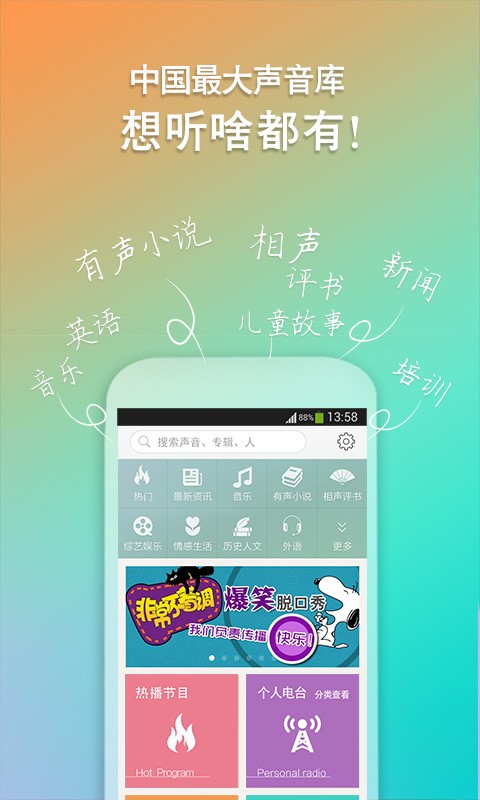 听有声小说、相声、评书、新闻、音乐、脱口秀、笑话段子、英语、儿歌儿童故事,就用喜马拉雅。喜马拉雅,你的手机随身听!