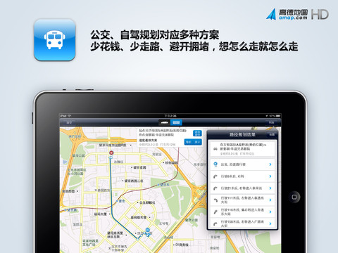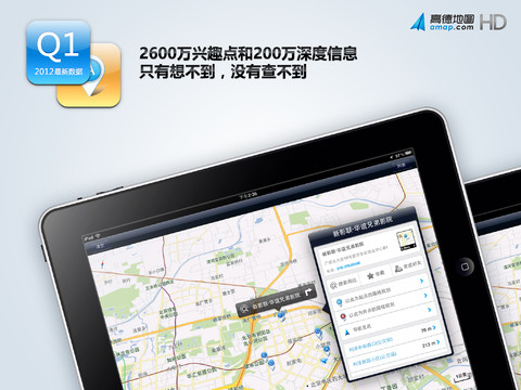 重磅推新: 本次发布的“高德地图HD版”完全适配ios6,3D地图场景逼真细节出色且运行速度飞快,超级炫酷,使看地图成为好玩的全新体验。“个人交通台”全面优化升级,智能动态导航让导航功能如虎添翼,一旦使用,保证你爱不释手。 “抢团购”每天更新5万多条优惠信息,衣食住行吃喝玩乐全包,实惠省钱天天有。高德地图1.0,0版,领先的地图导航功能、极大丰富的生活服务信息,不但是最好的ipad地图,更是完美的生活出行助手!