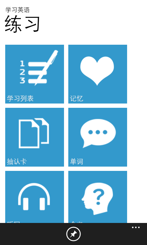 它提供一种休闲和交互的方式来学习英语,它有8种学习模式提供选择:学习列表,抽认卡,听,含义,记忆,拼写,单词,回顾。