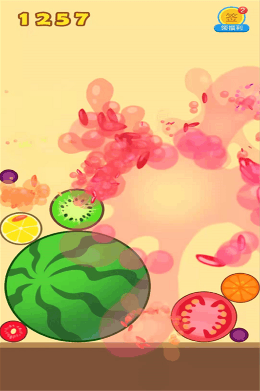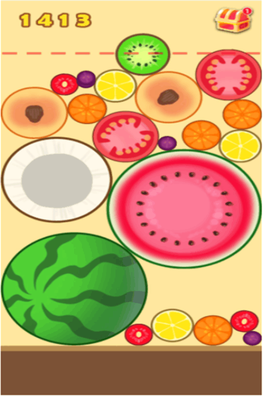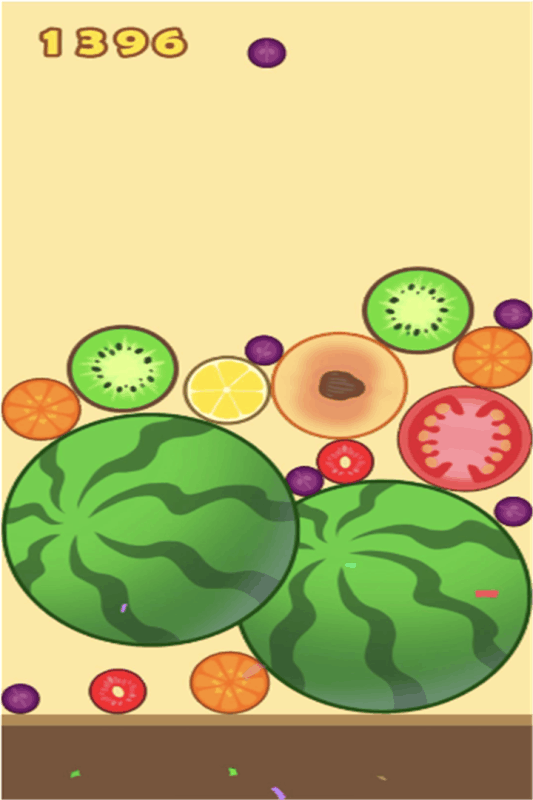 2、相同的水果从任意方向接触后,会合成一个更大的水果,最大的水果就是大西瓜。(类似 2048)