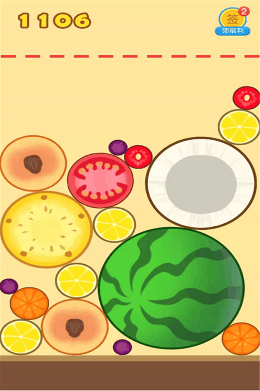 3、如果摆放的水果超过整个游戏的上限虚线(快接近时会有提示),游戏结束