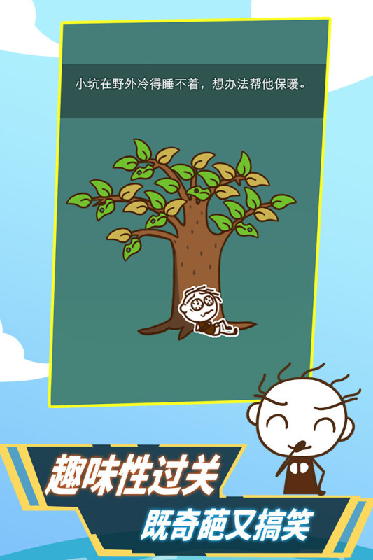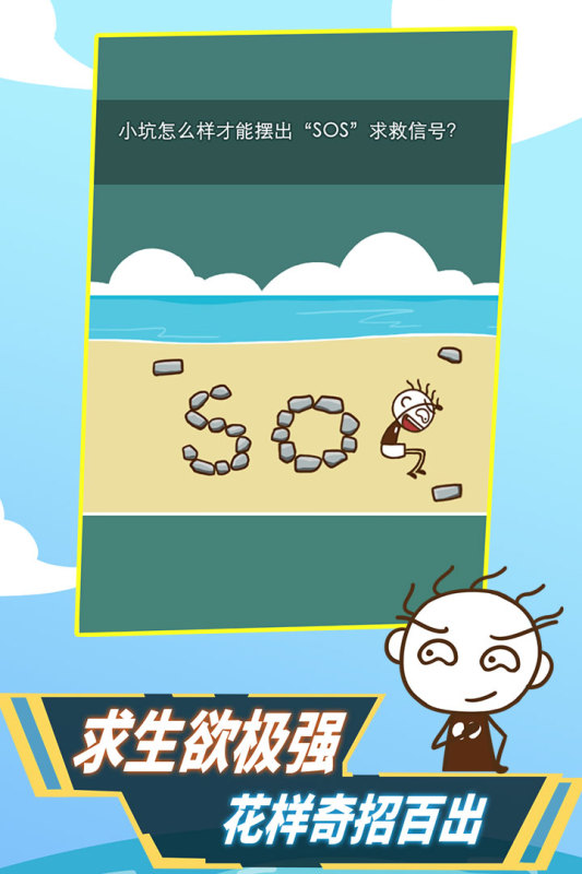 史小坑活下去为趣味性的解谜游戏,玩家的主要目标是拯救主人公史小坑。 史小坑一开始落难到荒岛上,不断遇到各种倒霉搞笑的事情,每一关史小坑都需要解决一个生存上的难题,缺水断粮、面临危险,遭遇野人,要解决各种问题,才能在岛上生存下去。核心玩法:以问答加操作的形式表现,每个关卡只有一个过关方式。 【关卡丰富,设计创新】 百余个精心设计的关卡,一路奇葩障碍,让你猝不及防,每一关都新奇搞笑,让你越玩越上瘾(抓