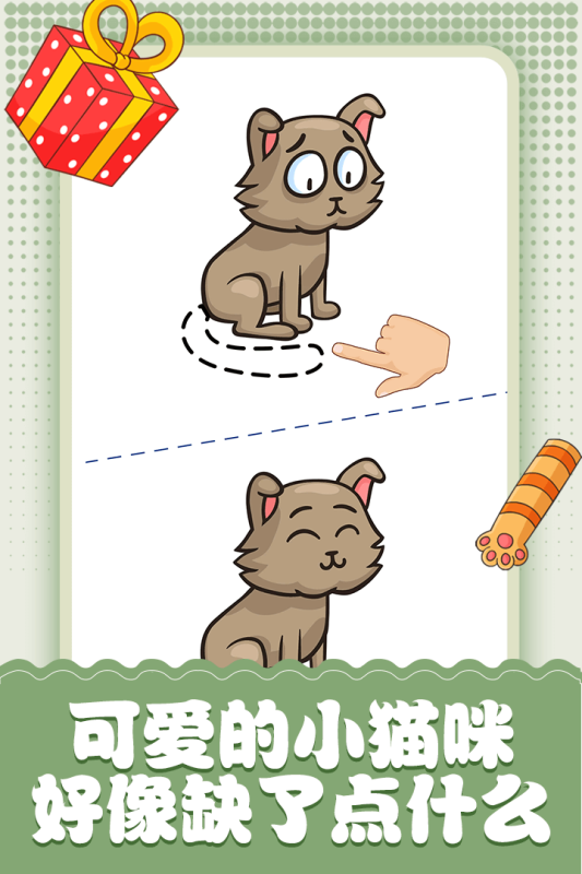 这是一款手脑共用的游戏。游戏中每个关卡你都只能获得一半的图片,首先你必须想出这究竟是什么,然后再动笔画出另一半。是不是听着挺简单,但是还有一个限制哦:你只能画一条线来完成它!一笔补全图片的缺失部分,而且每个关卡出现的事物都不同,快来《脑洞小画家》锻炼自己的想象能力和动手能力吧!