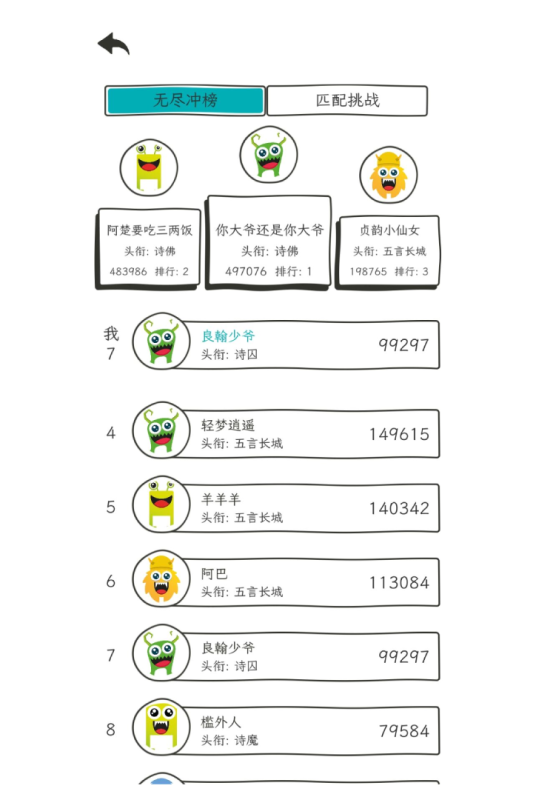 游戏有独自游玩,无限冲榜,匹配挑战三种游戏模式。