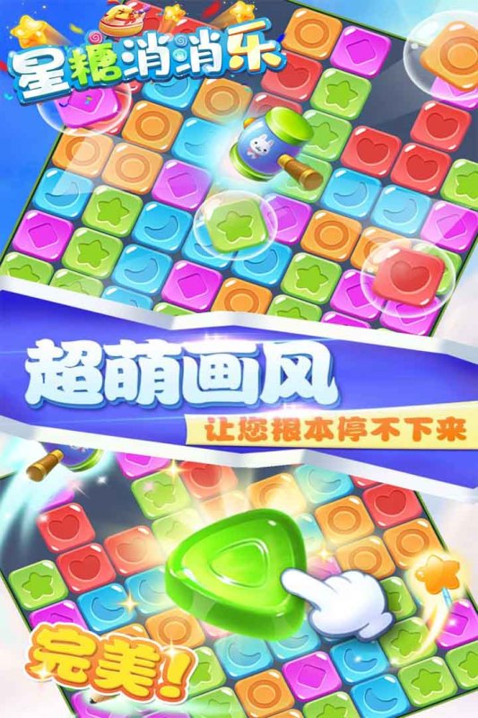 星糖消消乐是一款画面精美、制作精良、玩法简单易上手的消除类游戏。只需点击两个或两个以上颜色相同的星星即可消除他们。作为一款入门简单的游戏,十分适合业余时间娱乐休闲。