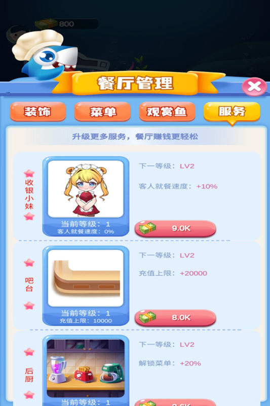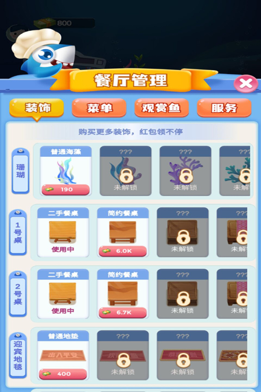 海洋主题的餐厅强势来袭,精美的画风萌化用户的心,在这里你将拥有一个属于自己的餐厅,能让你在线体验一把开餐厅的感觉,海洋馆里有很多未知的观赏鱼等你解锁体验哦。