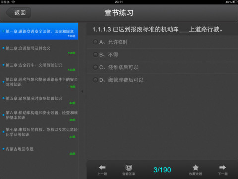 2.章节练习按照科目一考试的章节划分考题,针对性强化训练;