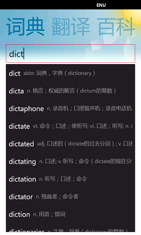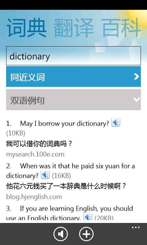 有道词典,是您随身携带的多语种互译词典。其精炼的中英本地词库让您随时随地享受自由快捷的本地翻译;单词发音、网络释义和超过千万的海量例句,通过无处不在的网络为您带来更加详尽权威的查询结果;国内领先的机器翻译系统,为您提供即时免费的全文翻译服务,无论您身在何方都能轻松摆脱语言鸿沟的困扰;百科功能更让您轻松掌握相关知识;单词本可实现与有道词典桌面版或者其他平台客户端的实时同步,帮您随时随地轻松背单词。