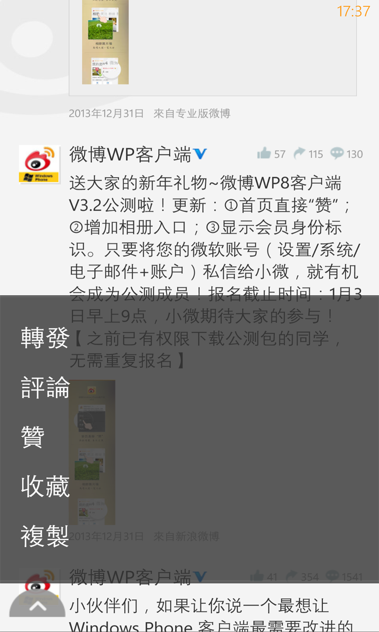 浪微博Windows Phone官方客户端,分享微博改变你的生活。 专为Windows Phone用户打造的新浪微博客户端,实现了阅读、发布、评论、转发、私信、关注等主要功能,支持本地相机即拍即传和地理位置分享,并支持主题换肤和新消息提醒。在微博中读新闻、看美图、听音乐、播视频一应俱全。