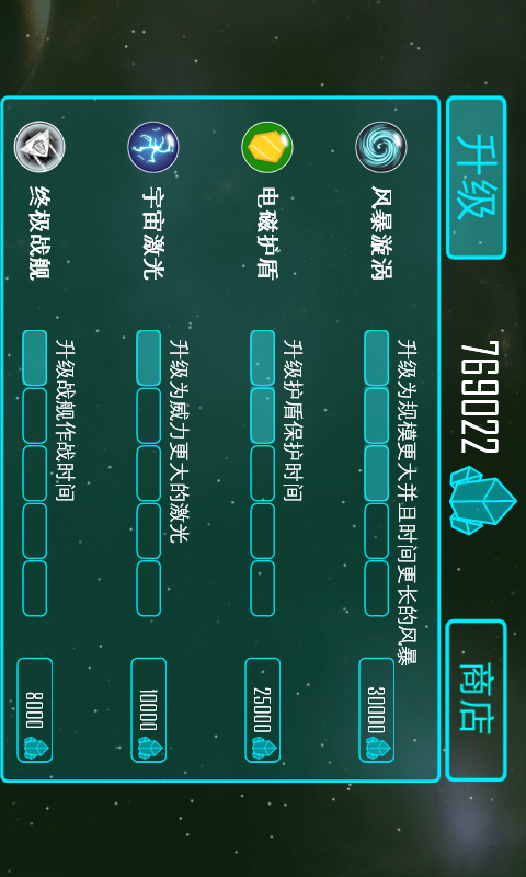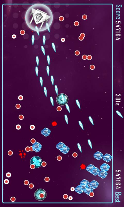 重力感应控制,倾斜手机调整飞船方向,躲开红色的小行星。飞向武器装置,使用他们将屏幕中的小行星一举消灭。