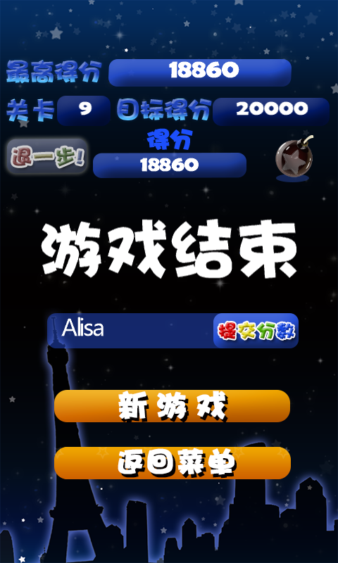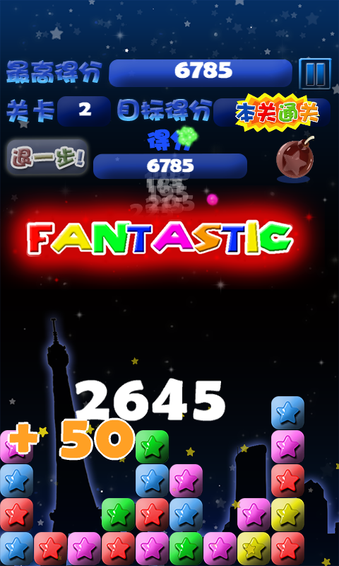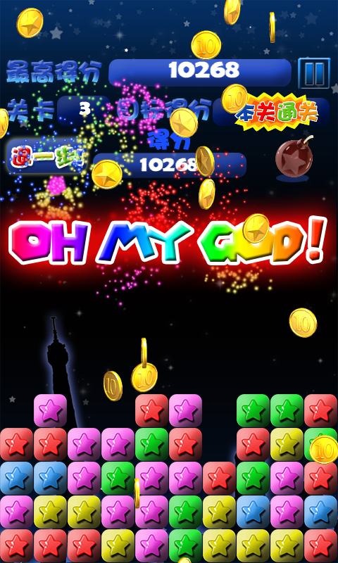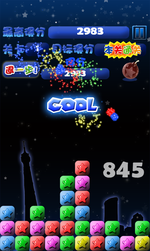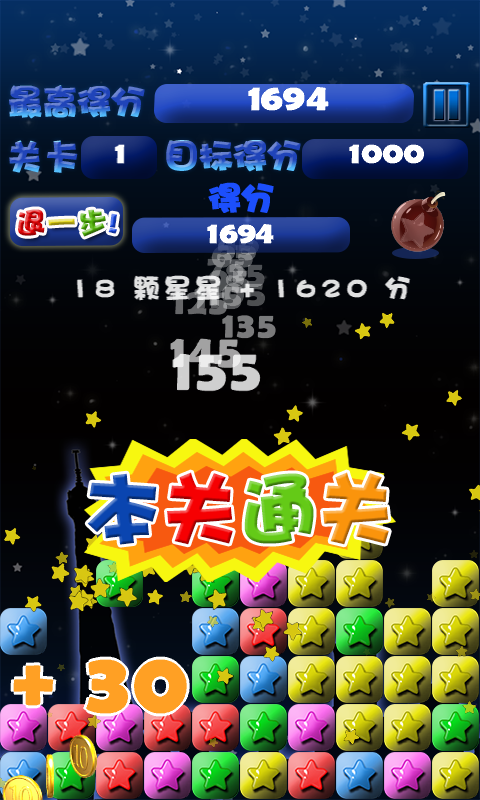 你可以使用“退一步”来取消上一步的操作,不过需要消耗一定的金币哦。炸弹道具可以帮助你获得更高的分数到达下一关。另外,如果本关不幸闯关失败,你也可以使用“重玩本关”来重新挑战失败的那一关。所有的道具使用都需要消耗金币,不过你可以一次性消除尽可能多的星星从而赚取更多的金币!